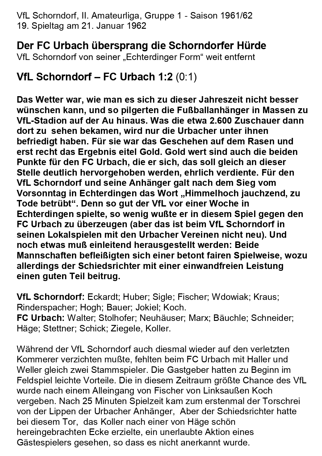 VfL Schorndorf II. Amateurliga Saison 1961 62 VfL Schorndorf FCTV Urbach 21.01.1962 Seite 1