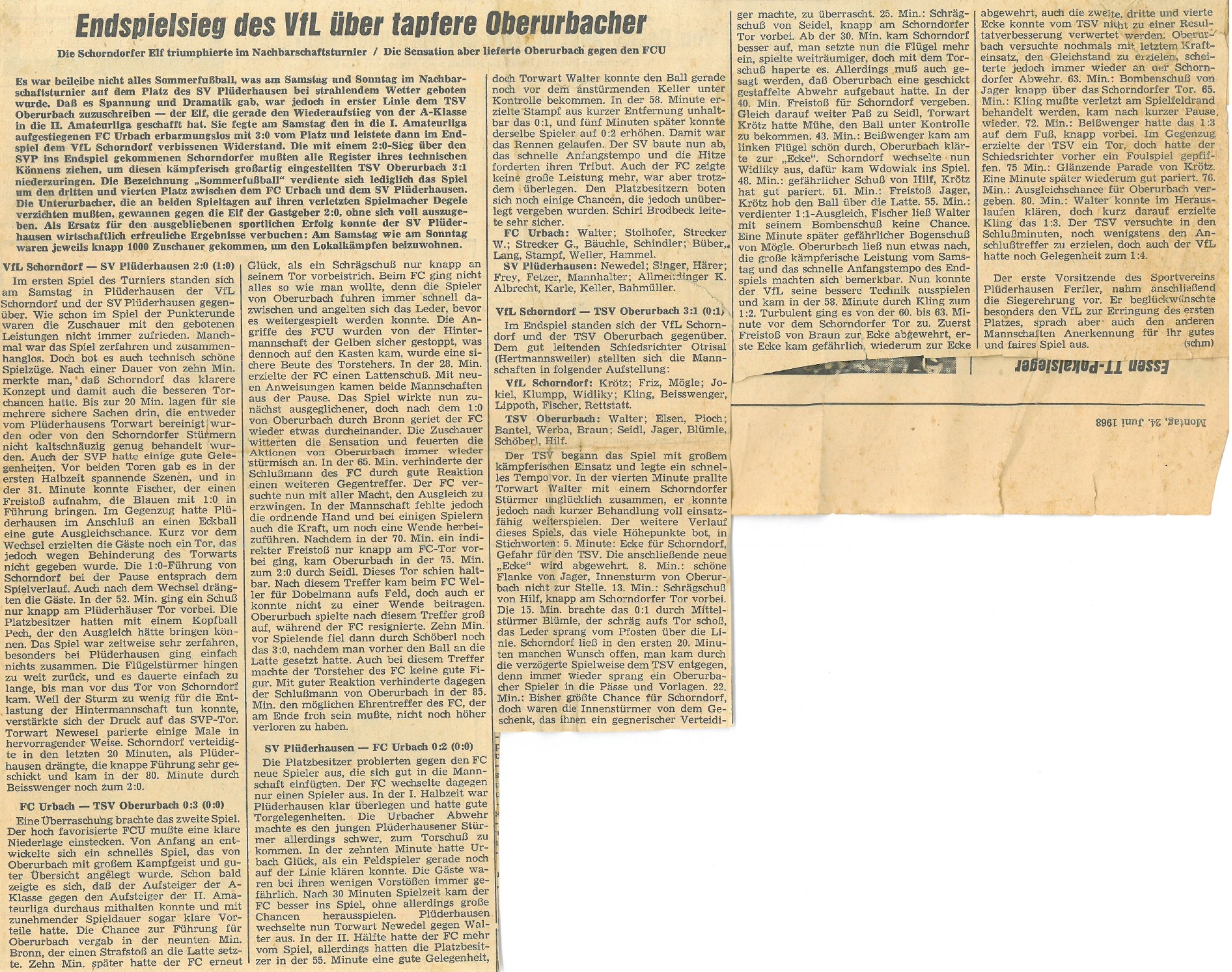 Nachbarschaftsturnier 22. und 23. Juin 1968 in Pluederhausen Zeitungsbericht