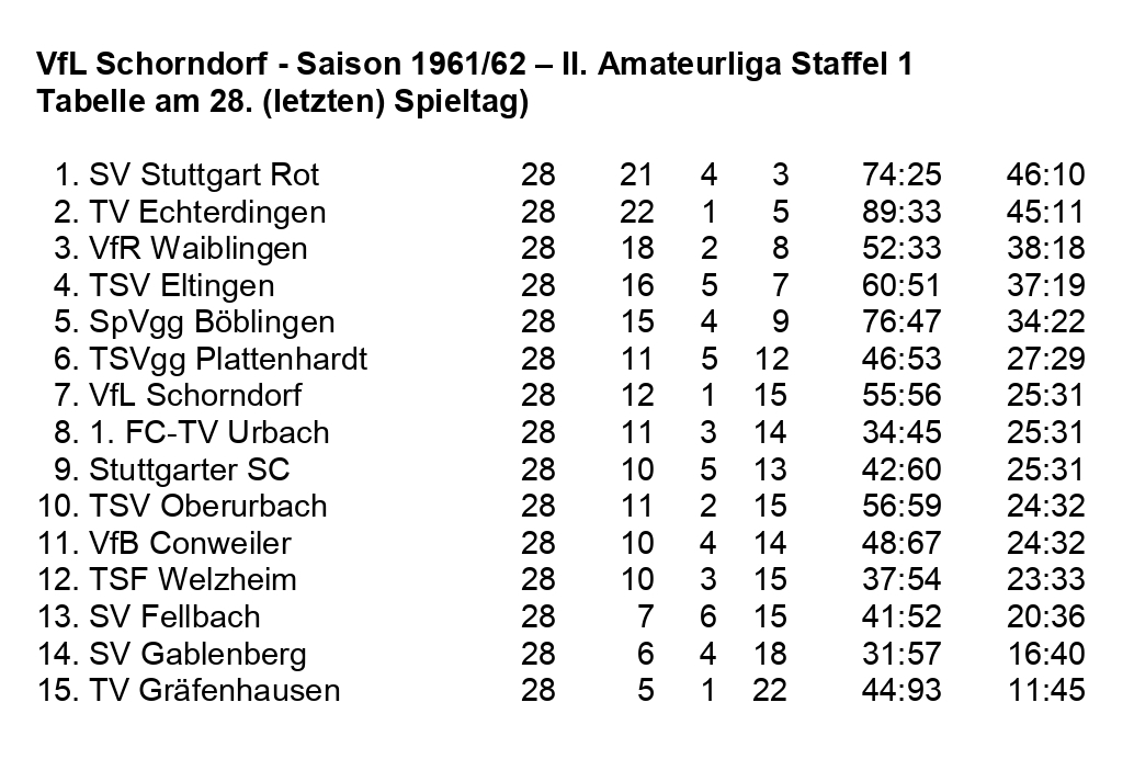 VfL Schorndorf Saison 1961 1962 II. Amateurliga Staffel 1 Abschluss-Tabelle 28. Spieltag