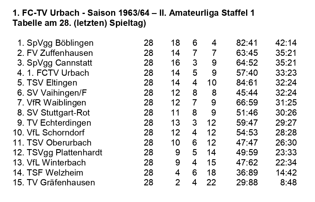 FCTV Urbach Saison 1963 1964 II. Amateurliga Staffel 1 Abschluss-Tabelle 28. Spieltag