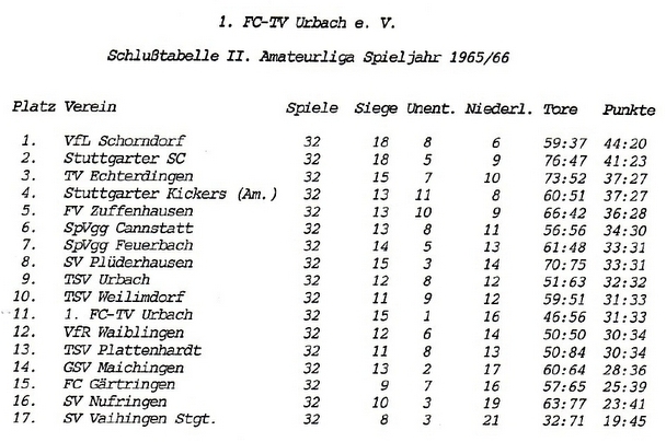 FCTV Urbach Saison 1964 1965 II. Amateurliga Staffel 1 Abschluss-Tabelle 32. Spieltag