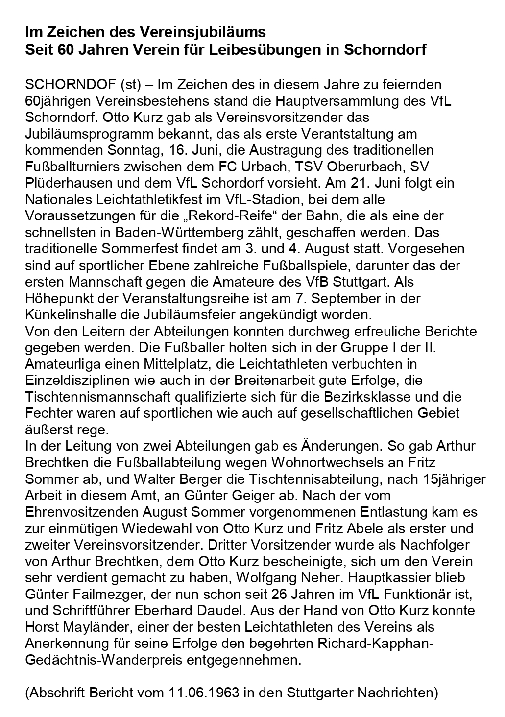 VfL Schorndorf 60jaehriges Jubilaeum 1963 Bericht ueber Haupversammlung