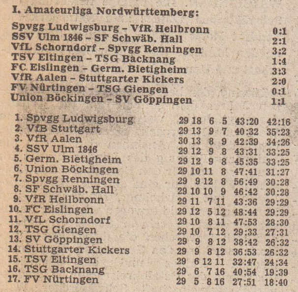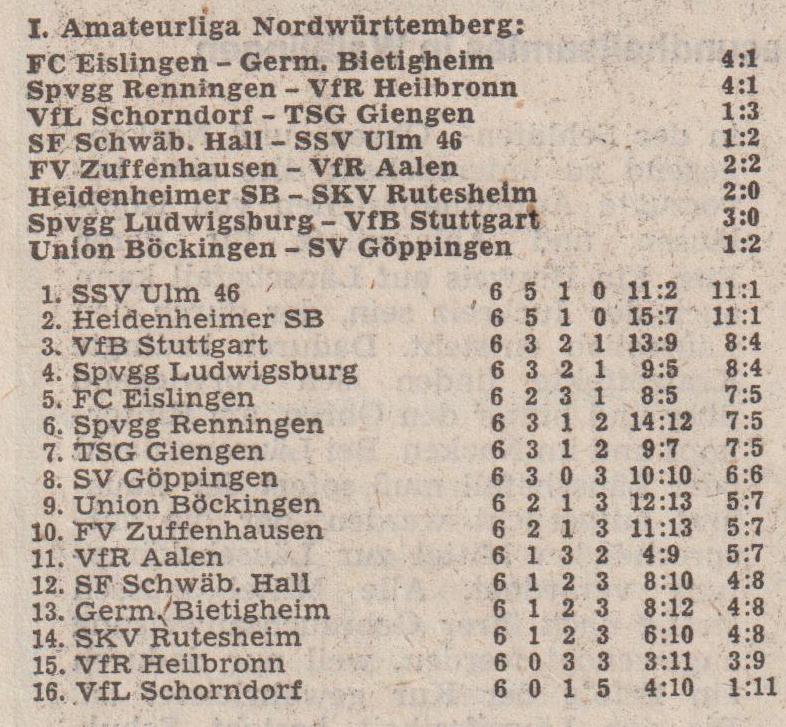 I. Amateurliga Nordwuerttemberg Saison 1976 77 Begegnungen Tabelle 6. Spieltag 19.09.1976