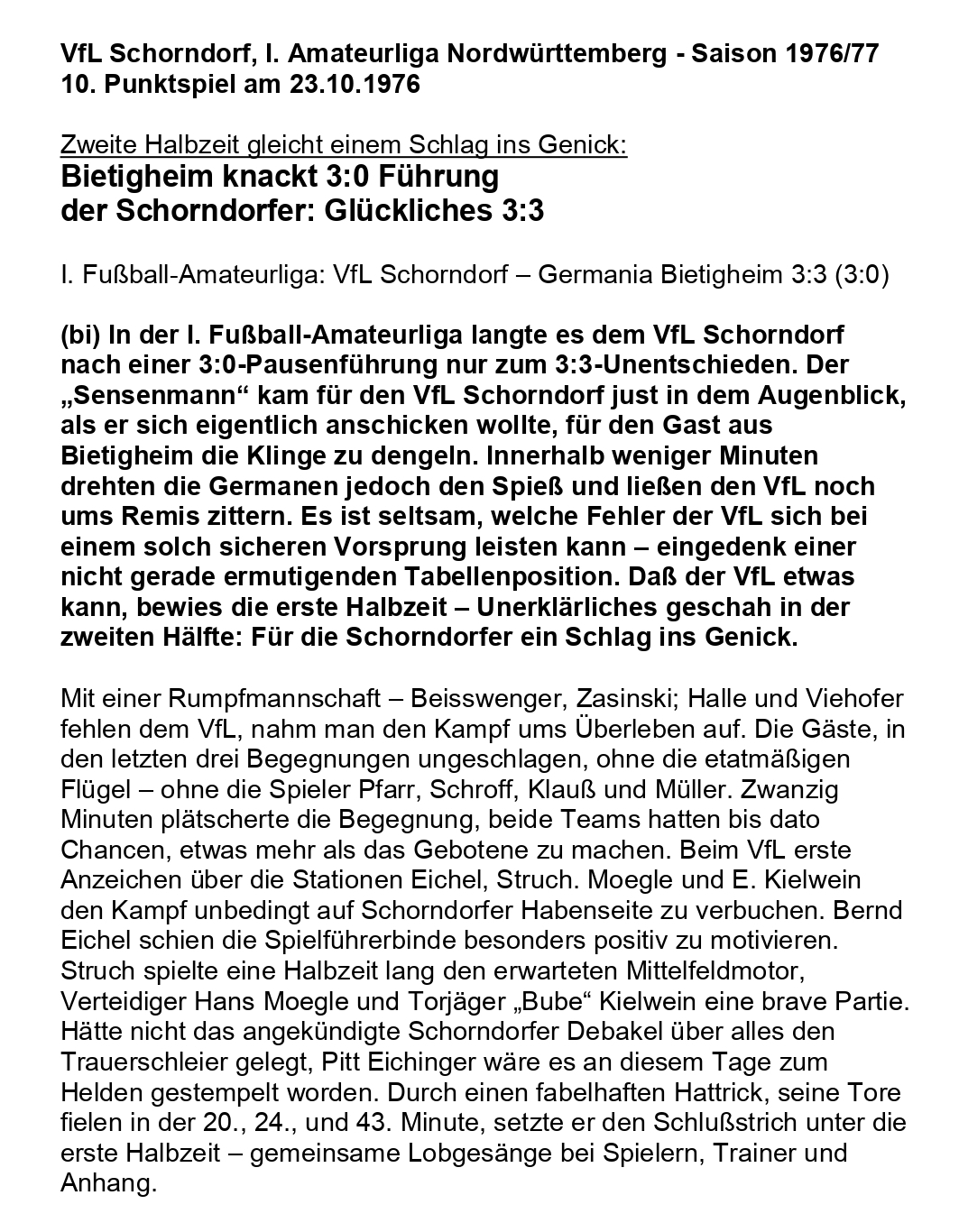 VfL Schorndorf I. Amateurliga Saison 1976 77 VfL Schorndorf Germania Bietigheim Abschrift Bericht Spieltag 23.10.1976 Seite 1