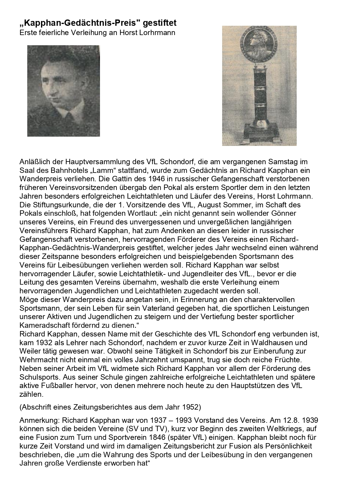 Kapphan Gedaechtnis Preis gestifet Zeitungsartikel von 1952 Abschrift