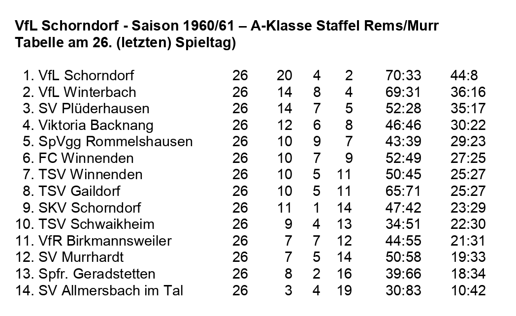 VfL Schorndorf Saison 1960 1961 A-Klasse Staffel Rems Murr 26. Spieltag