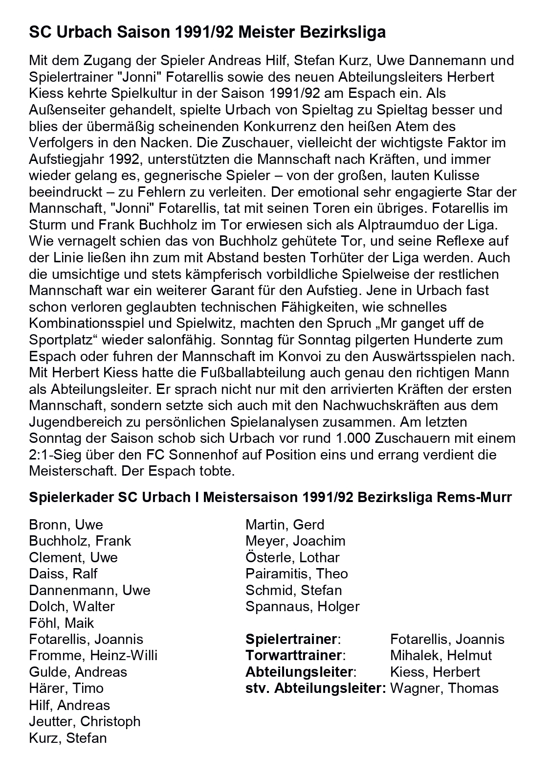 SC Urbach Saison 1991 92 Meister Bezirksliga Saisonbericht