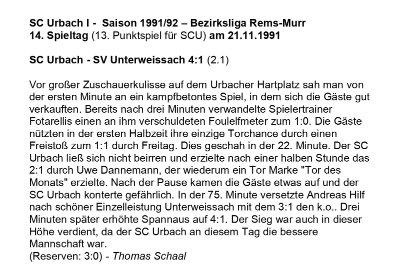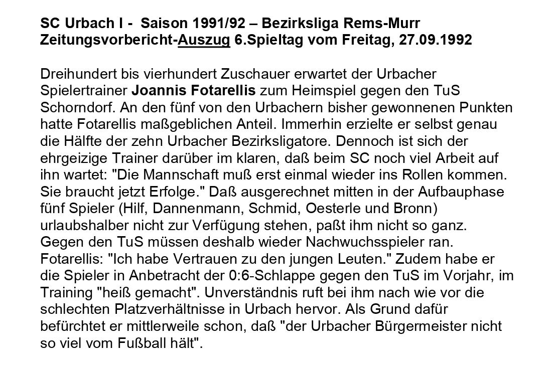 SC Urbach Saison 1991 92 Zeitungs-Vorbericht 6. Spieltag am 27.09.1991