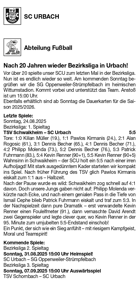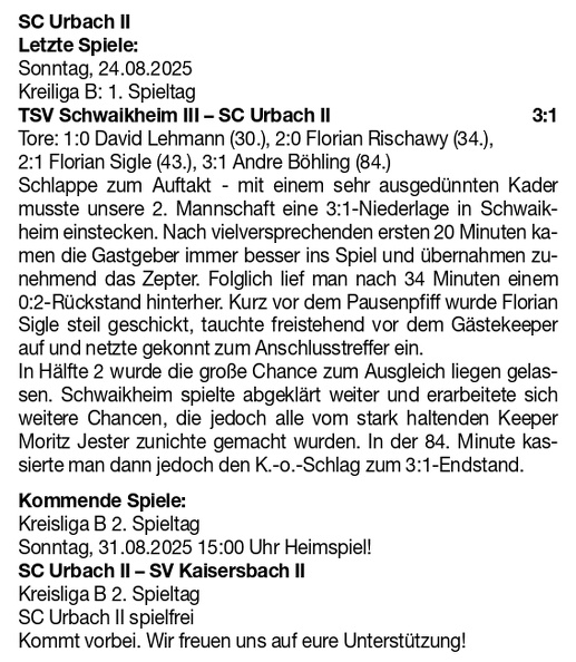 SC Urbach Saison 2025 26 Spieltag 24.08.2025 Teil 1
