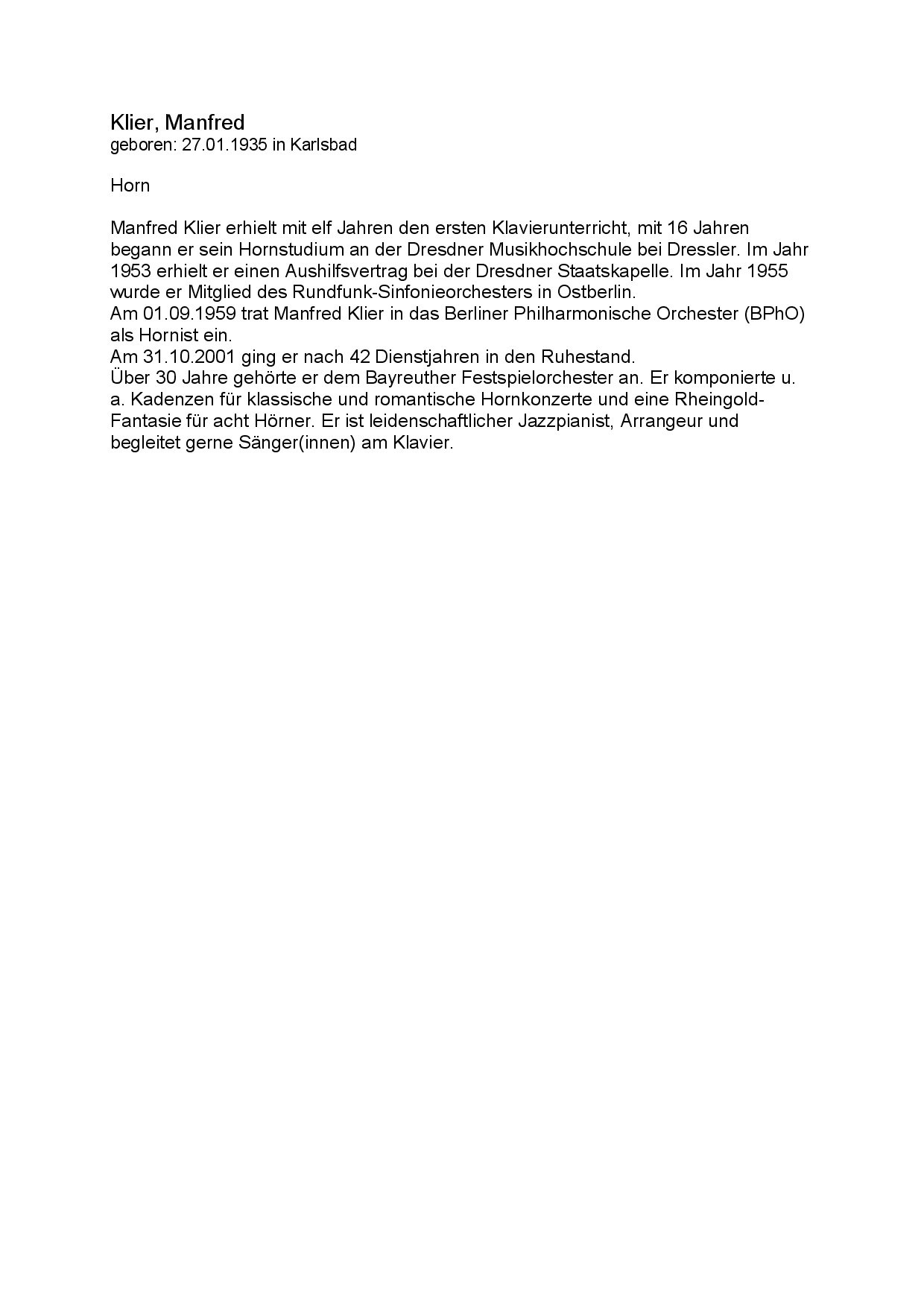 Klier Manfred 27.01.1935 Kurzbiographie