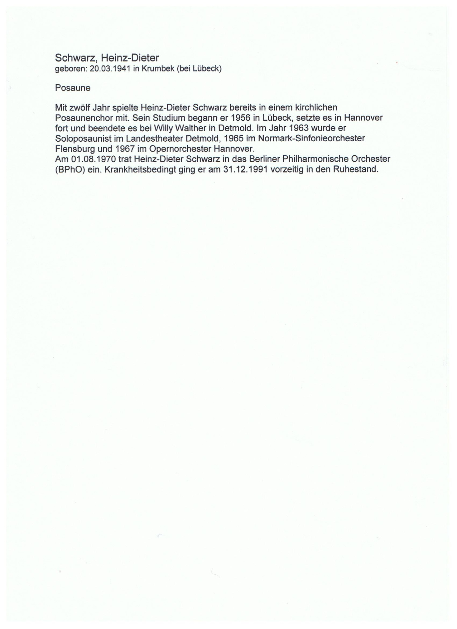 Schwarz Heinz Dieter 20.03.1941 Kurzbiographie