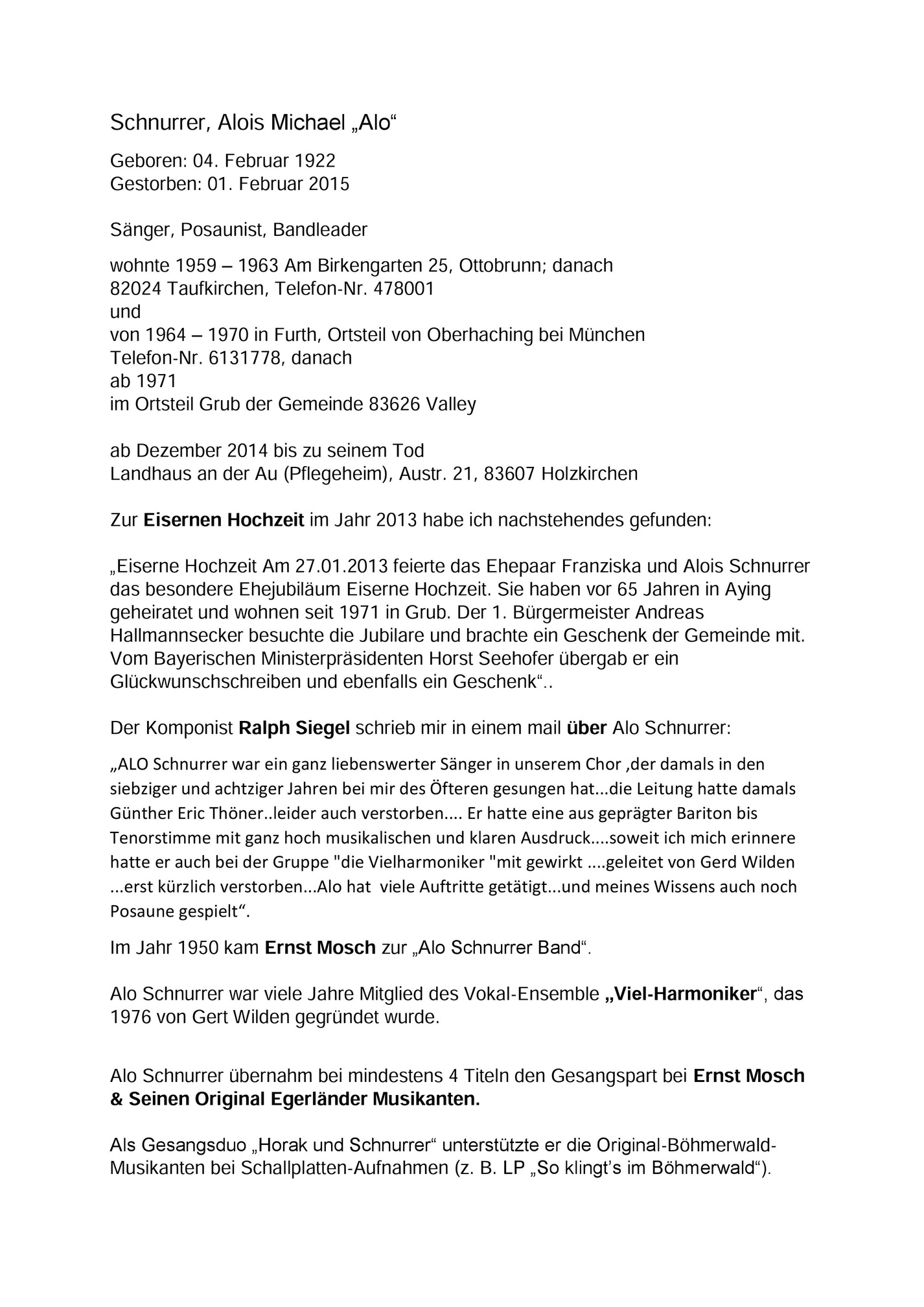 Schnurrer Alois Alo 1922 2015 Kurzbiographie