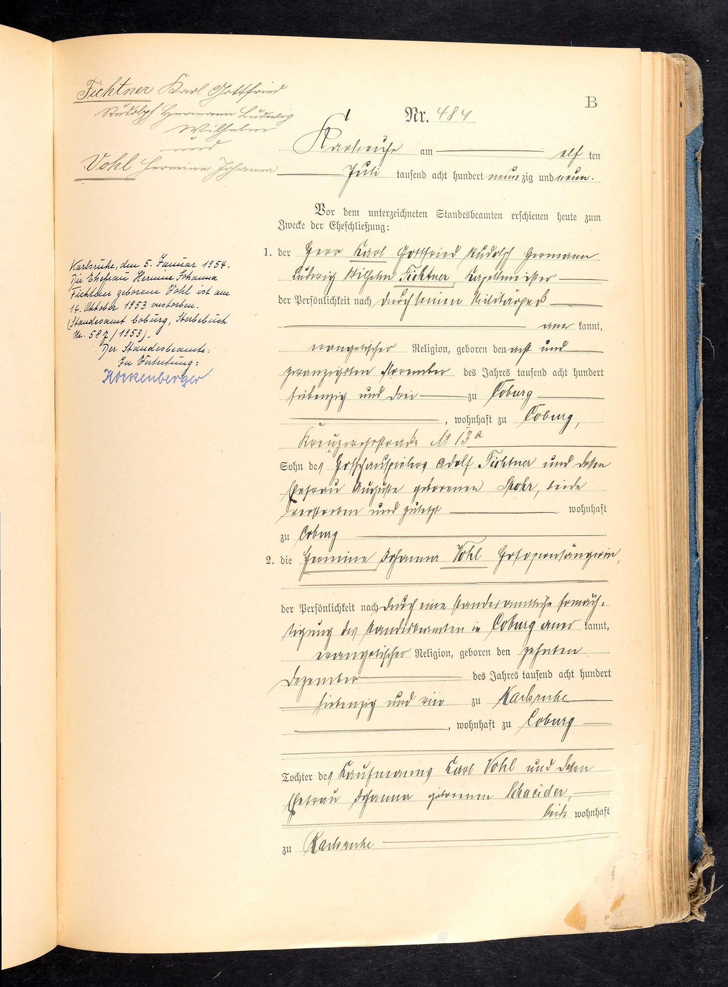 Fichtner Carl 1873 1959 Heiratsurkunde 1899 Seite 1