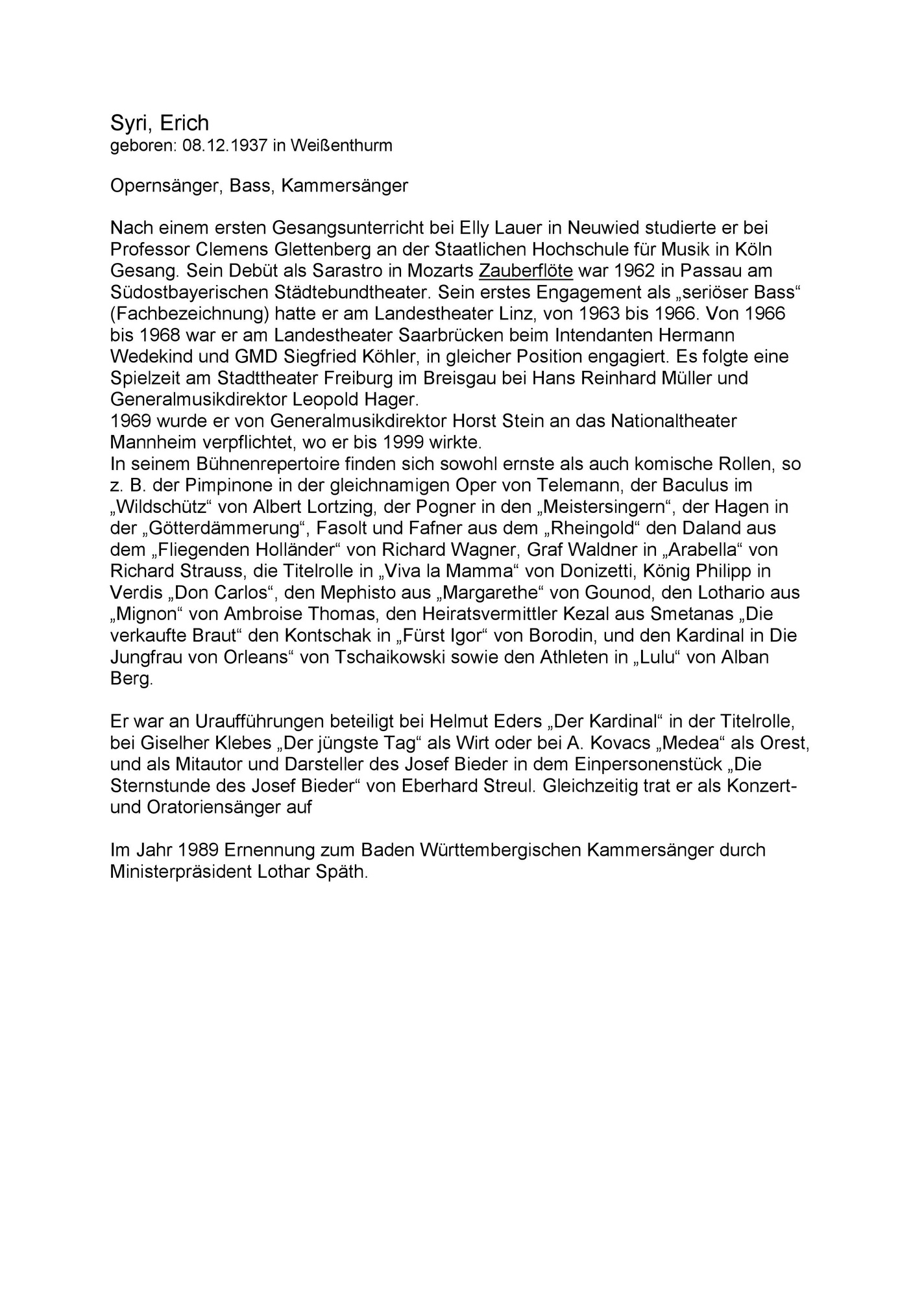 Syri Erich 08.12.1937 Kurzbiographie