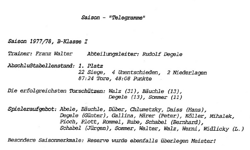 Saison Telegramm 1977 1978 Meistersaison