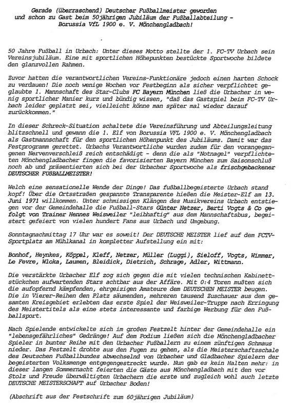 Jubiläum 1971 FCTV Urbach Borussia Mönchengladbach