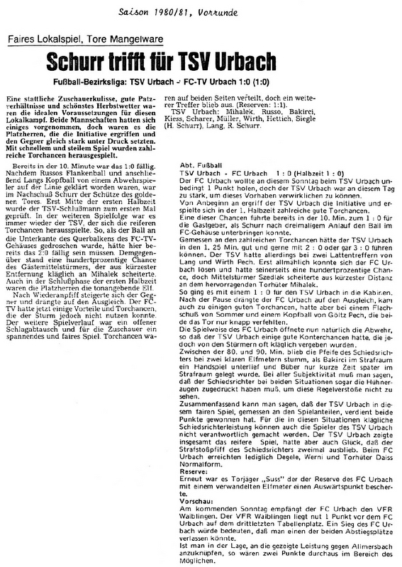 TSV Urbach FCTV Urbach Saison 1980 81