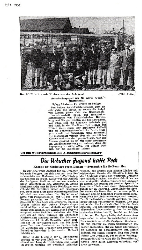 FCTV Urbach A-Jugend 1958 Endspiel Wuerttembergische Meisterschaft Bericht