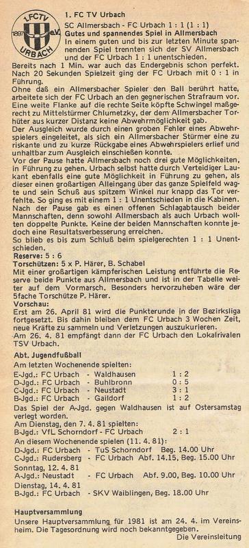 SV Allmersbach FCTV Urbach Saison 1980 81