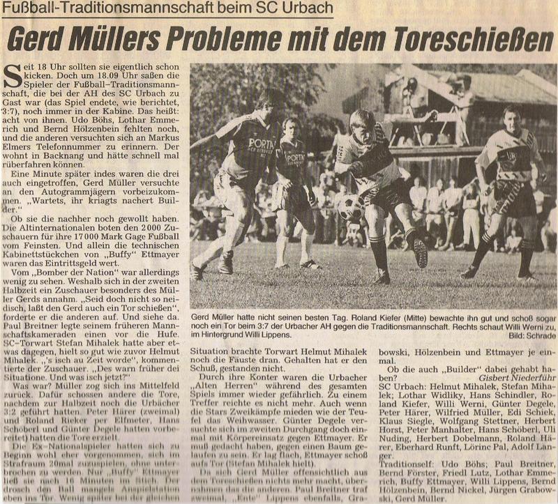 Fussball Hit 18.08.1989 SC Urbach AH FC Rhein-Main Promineten-Mannsschaft Zeitungsbericht