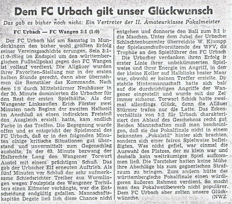FCTV Urbach 1958 Glueckwunsch zum Pokalsieg 22.11.1958 NWZ