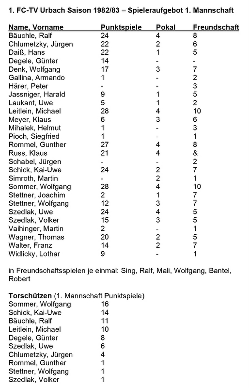 FCTV Urbach Saison 1982 83 Spieleraufgebot Torschuetzen