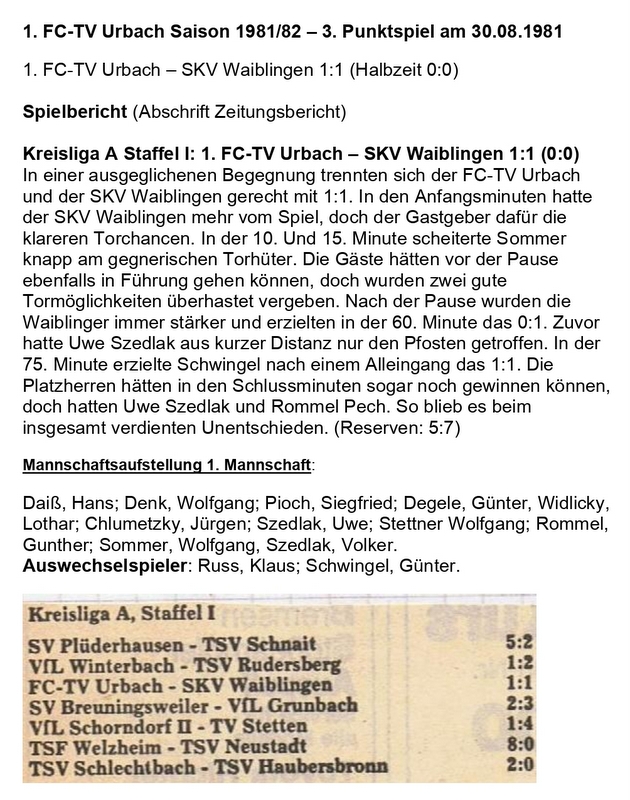 FCTV Urbach SKV Waiblingen Saison 1981 82 1. Punktspiel am 30.08.1981