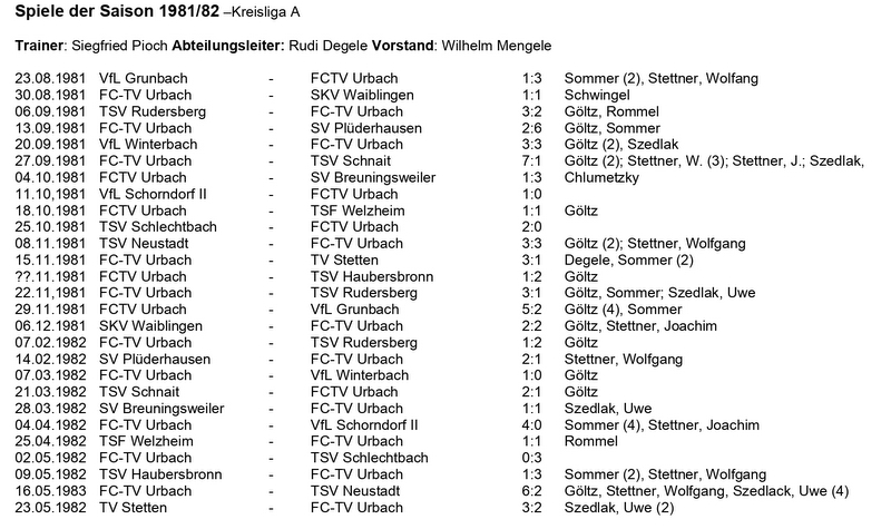 FCTV Urbach Spiele der Saison 1981 82 Kreisliga A