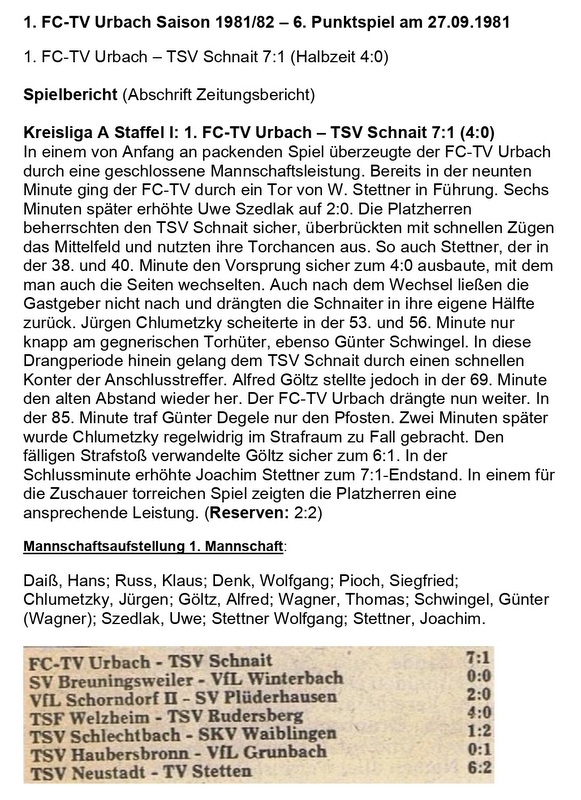 FCTV Urbach TSV Schnait Saison 1981 82 6. Punktspiel am 27.09.1981