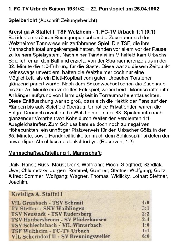 TSF Welzheim FCTV Urbach Saison 1981 82 22. Punktspiel am 25.04.1982