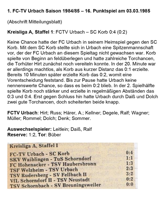 FCTV Urbach Saison 1984 85 FCTV Urbach SC Korb 16. Spieltag am 03.3.1985