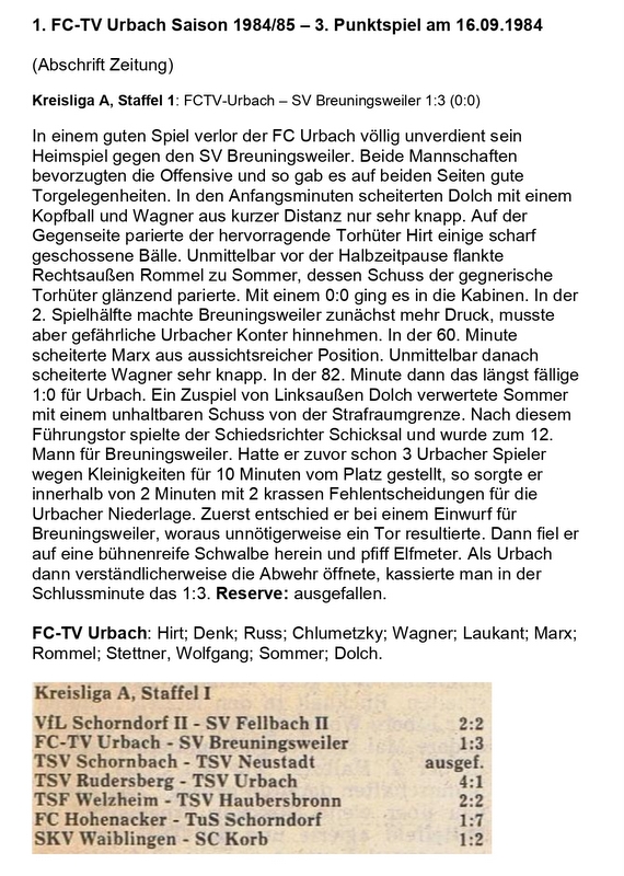 FCTV Urbach Saison 1984 85 FCTV Urbach SV Breuningsweiler 3. Spieltag am 16.09.1984