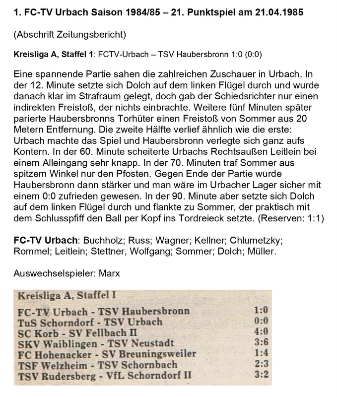 FCTV Urbach Saison 1984 85 FCTV Urbach TSV Haubersbronn 21. Spieltag am 21.04.1984