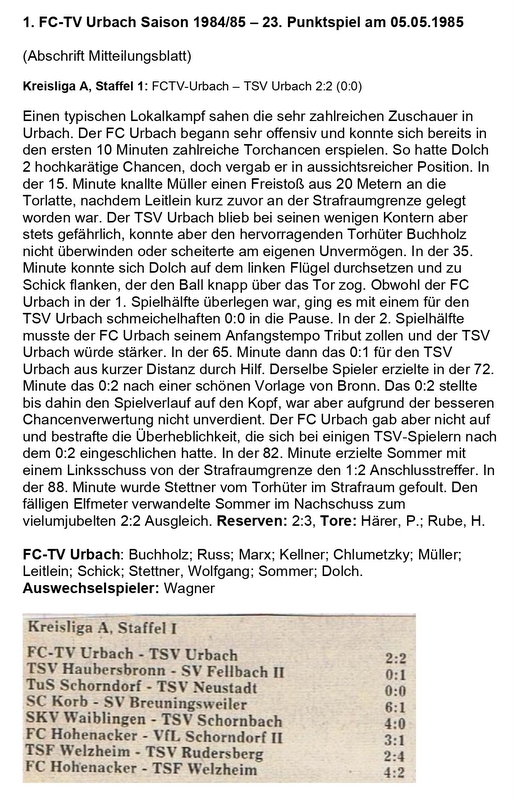 FCTV Urbach Saison 1984 85 FCTV Urbach TSV Urbach 23. Spieltag am 05.05.1985