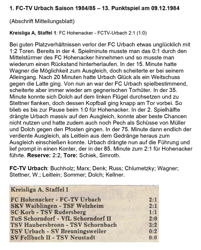 FCTV Urbach Saison 1984 85 FC Hohenacker FCTV Urbach 13. Spieltag am 09.12.1984