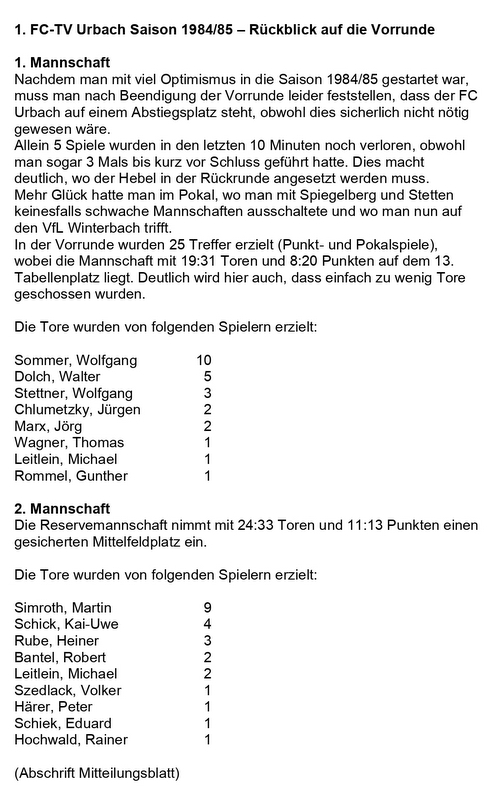 FCTV Urbach Saison 1984 85 FCTV Urbach Saison 1984 85 Rueckblick auf die Vorrunde