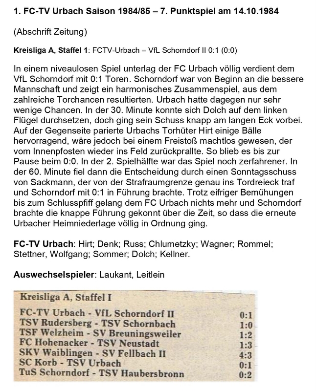 FCTV Urbach Saison 1984 85 FCTV Urbach VfL Schorndorf II 7. Spieltag am 14.10.1984