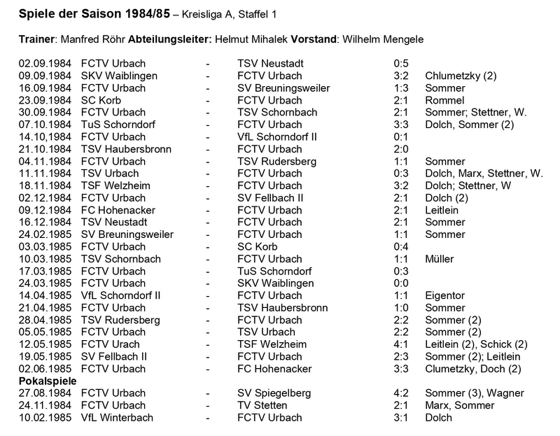 FCTV Urbach Saison 1984 1985