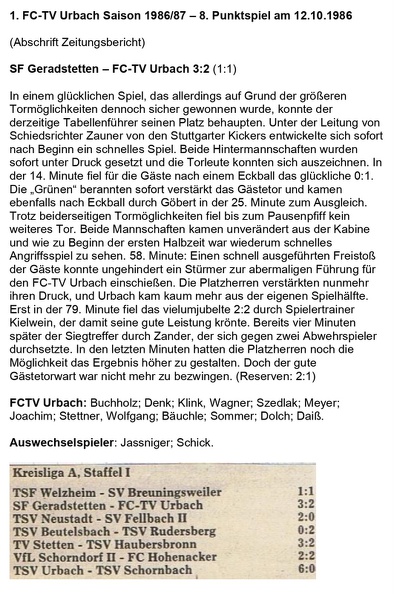FCTV Urbach Saison 1986 87 7. Punktspiel FCTV Urbach TSF Welzheim 05.10.1986