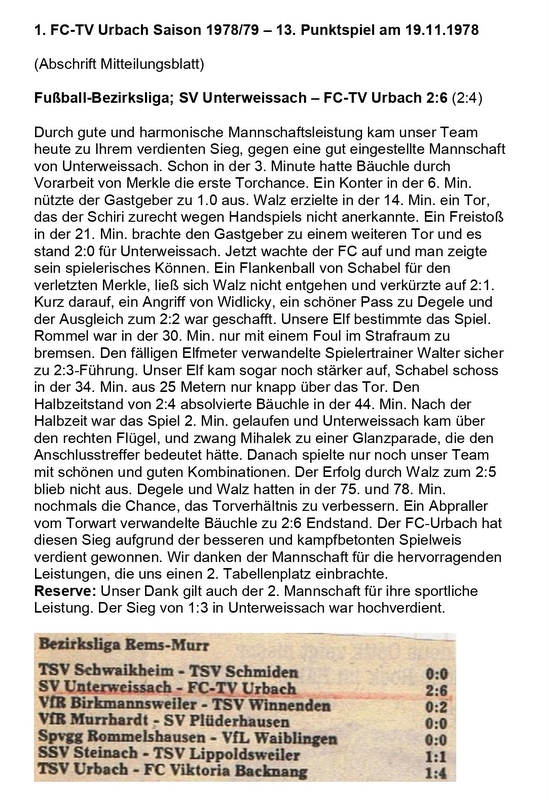 FCTV Urbach Saison 1978 79 13.. Spieltag SV Unterweissach FC-TV Urbach 19.11.1978