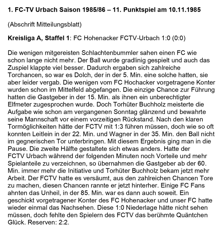 FCTV Urbach Saison 1985 86 FC Hohenacker FCTV Urbach 11. Spieltag am 10.11.1985