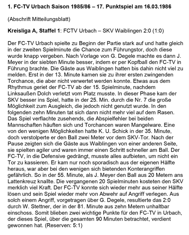 FCTV Urbach Saison 1985 86 FCTV Urbach SKV Waiblingen 19. Spieltag am 16.03.1986