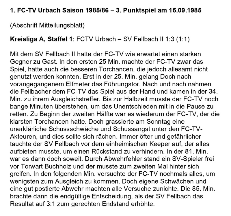 FCTV Urbach Saison 1985 86 FCTV Urbach SV Fellbach II 3. Spieltag am 15.09.1985