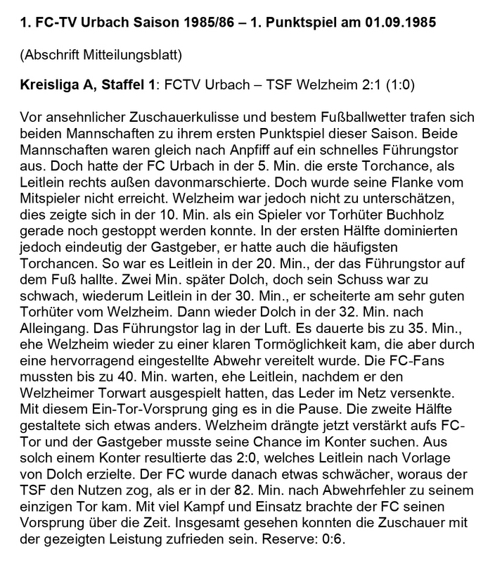 FCTV Urbach Saison 1985 86 FCTV Urbach TSF Welzheim 1. Spieltag am 01.09.1985