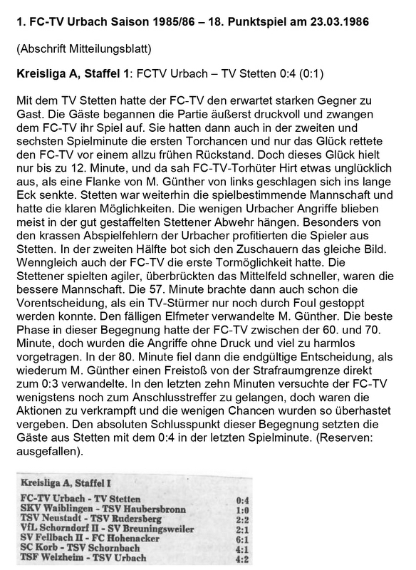 FCTV Urbach Saison 1985 86 FCTV Urbach TV Stetten am 23.03.1986