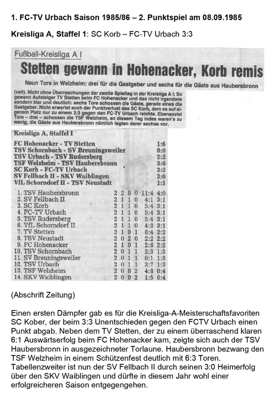 FCTV Urbach Saison 1985 86 SC Korb FCTV Urbach 2. Spieltag am 08.09.1985