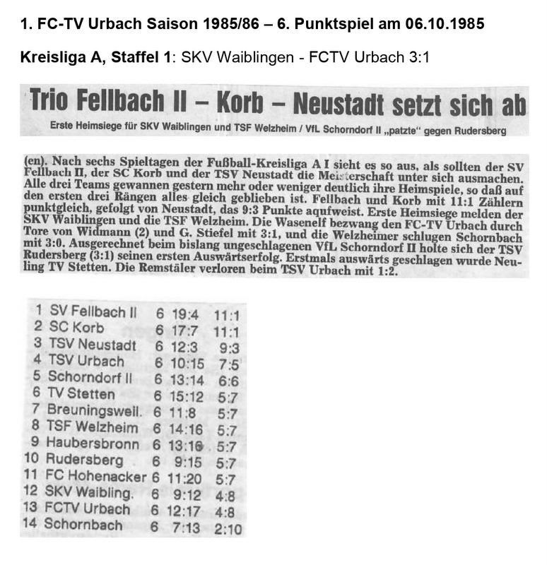FCTV Urbach Saison 1985 86 SKV Waiblingen FCTV Urbach 6. Spieltag am 06.10.1985