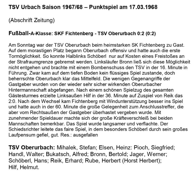 TSV Urbach Saison 1967 1968 SKF Fichtenberg TSV Oberurbach 17.03.1968
