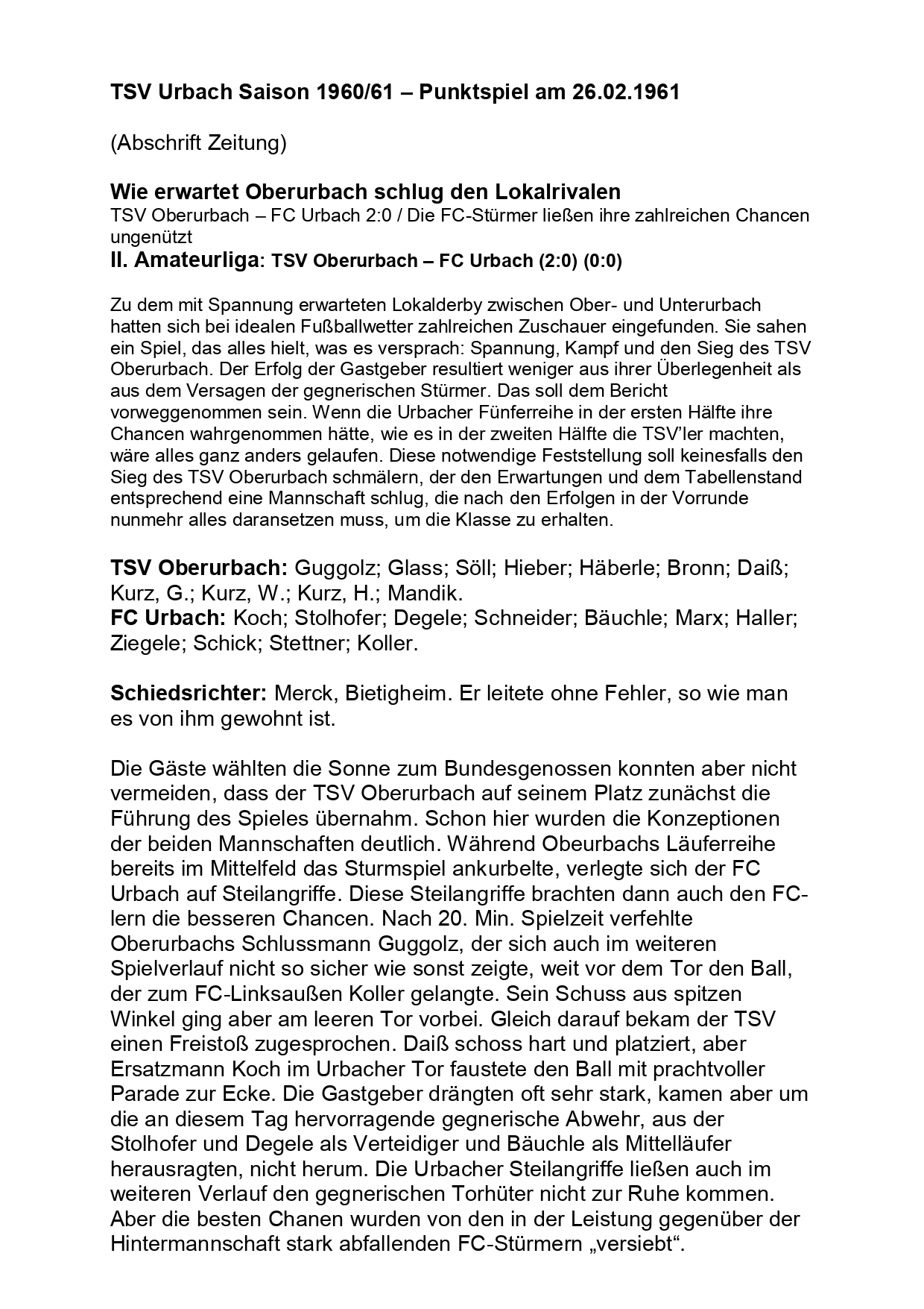 TSV Urbach Saison 1960 1961 TSV Oberurbach FC Urbach 26.02.1961 Seite 1