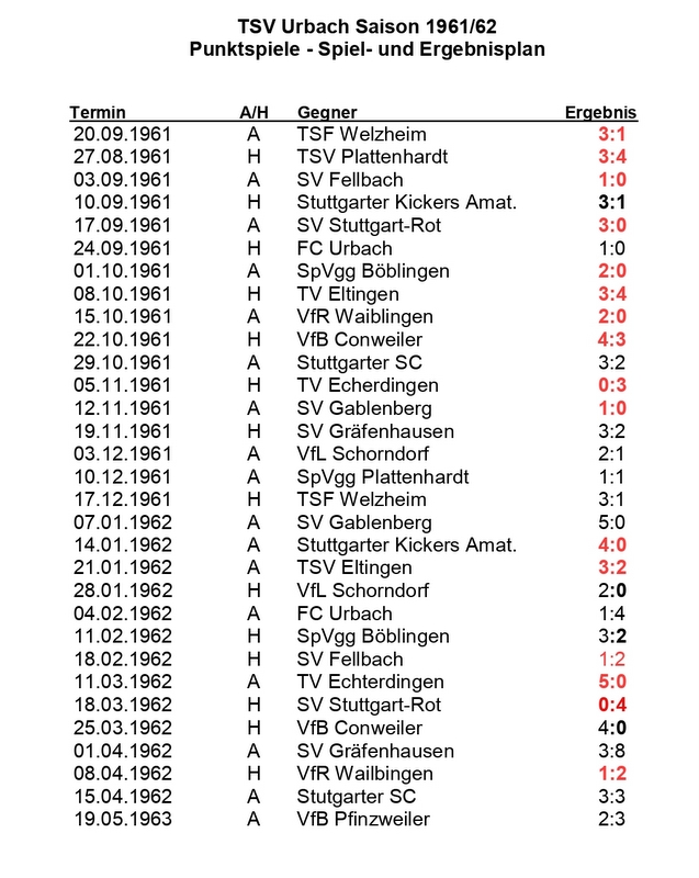TSV Urbach Saison 1961 1962 Spiel- und Ergebnisplan